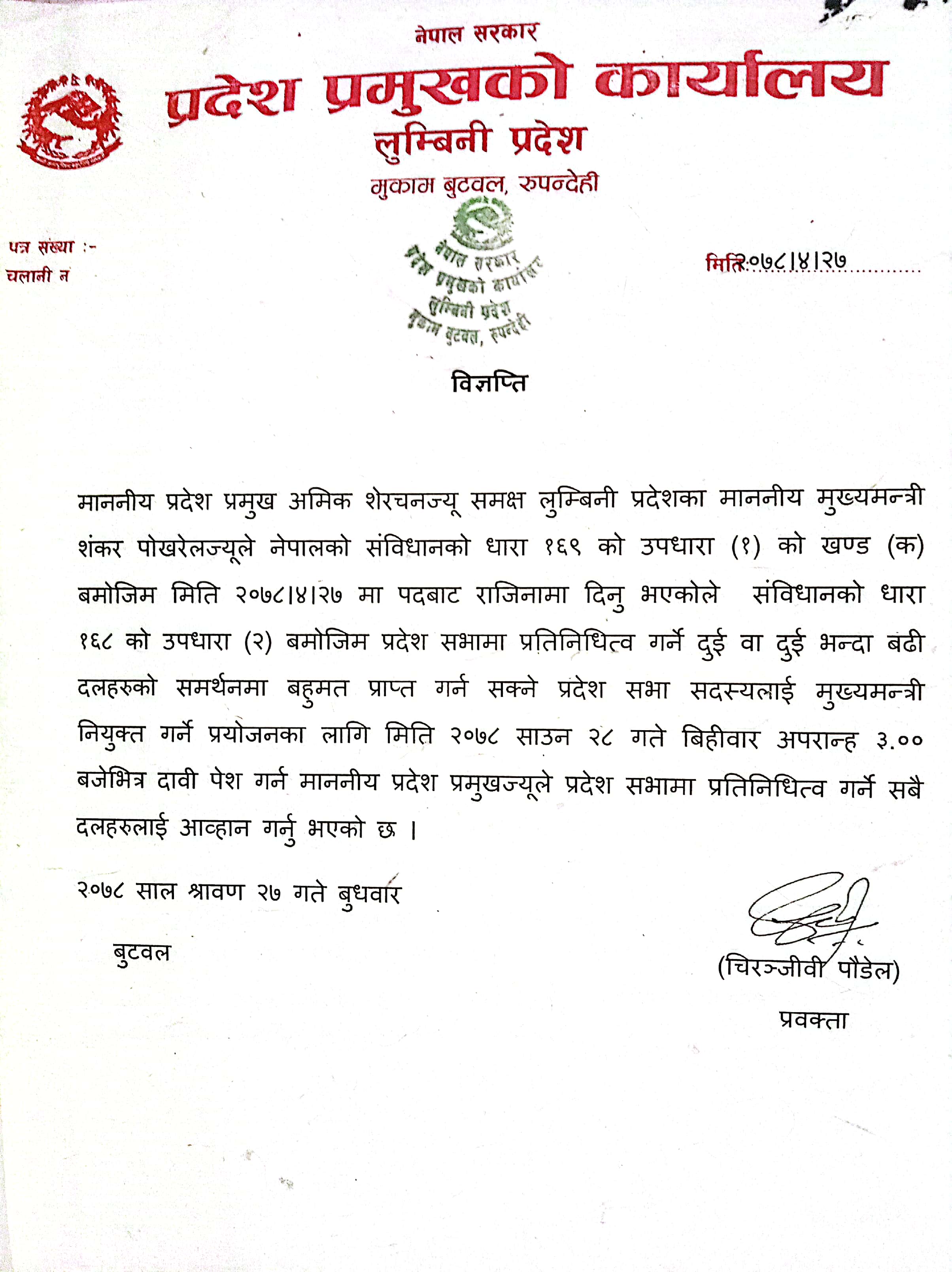 मुख्यमन्त्री नियुक्त गर्ने प्रयोजनका लागि दावी पेश सम्बन्धी विज्ञप्ति