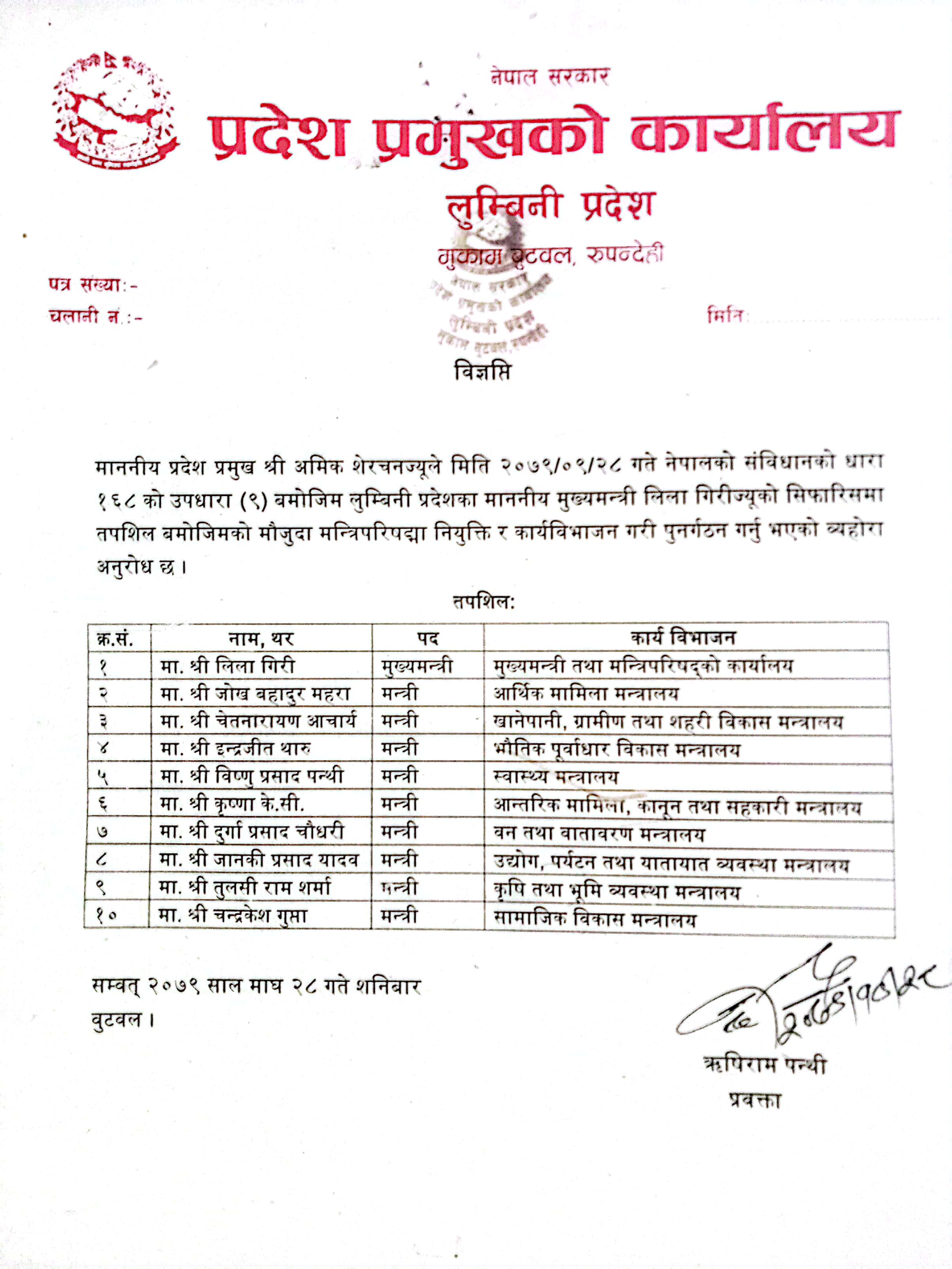 मौजुदा मन्त्रिपरिषद्मा नियुक्ति र कार्यविभाजन गरी पुनर्गठन सम्बन्धी विज्ञाप्ति
