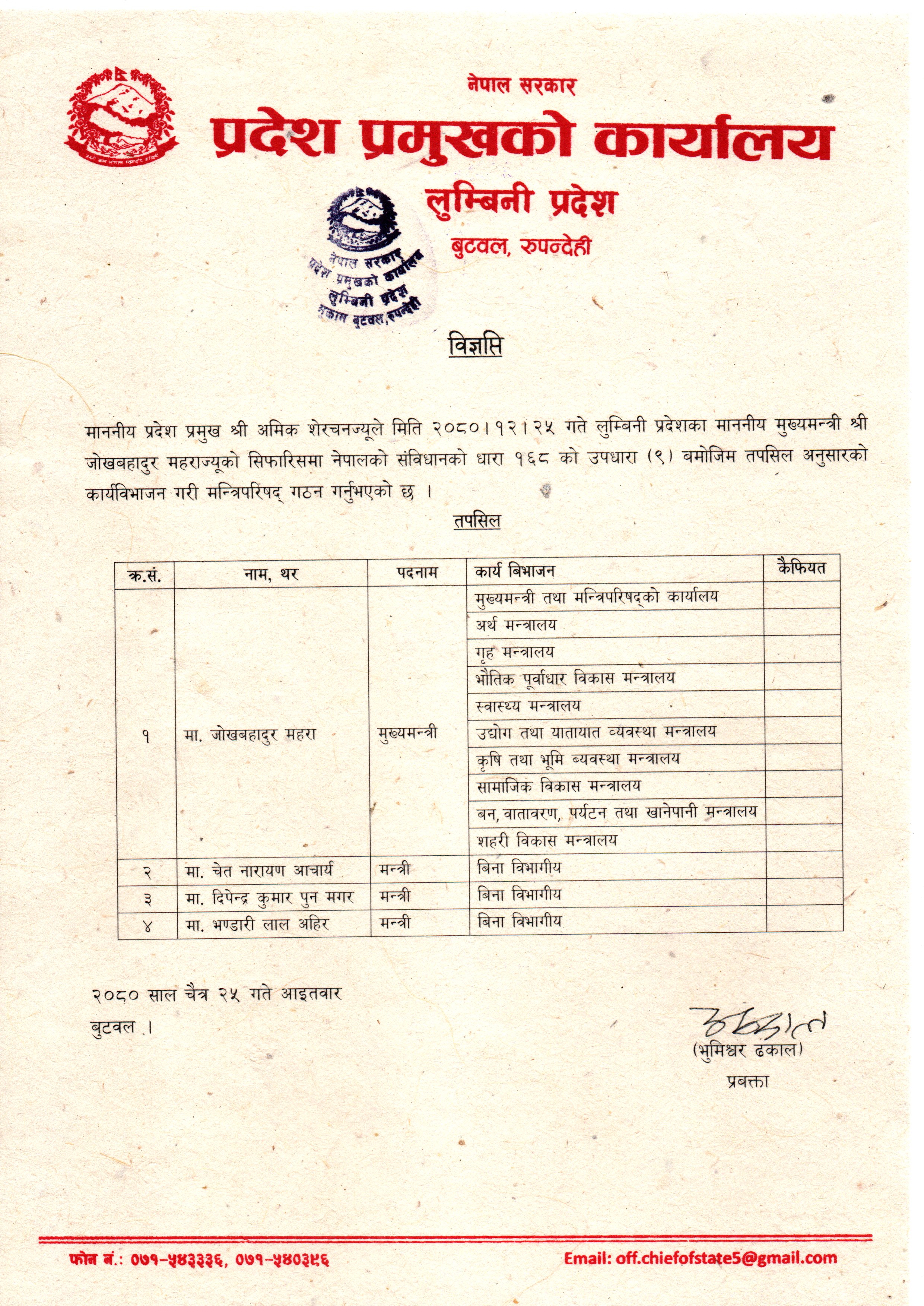 कार्यविभाजन गरी मन्त्रिपरिषद् गठन सम्बन्धि विज्ञप्ति ।