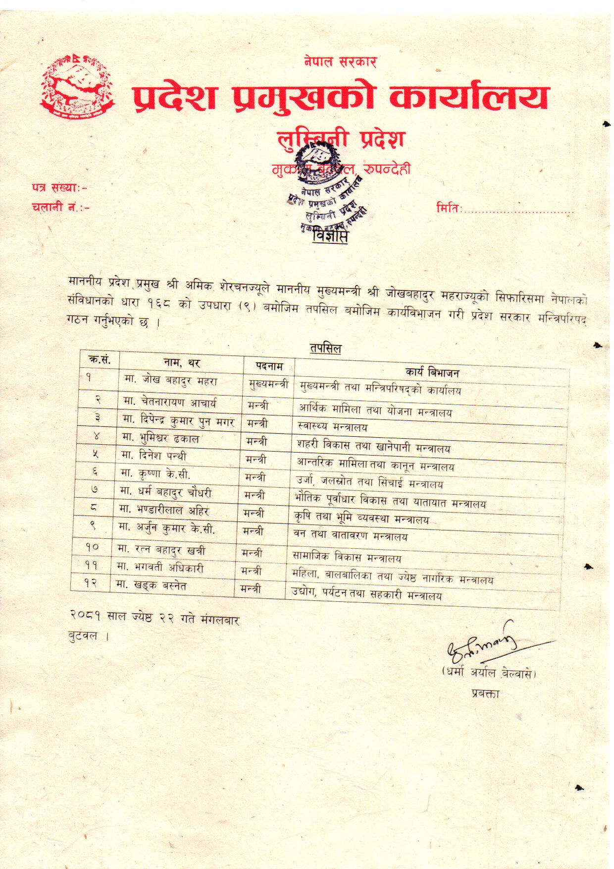 कार्यविभाजन गरी प्रदेश सरकार मन्त्रिपरिष्द गठन सम्बन्धि विज्ञप्ति