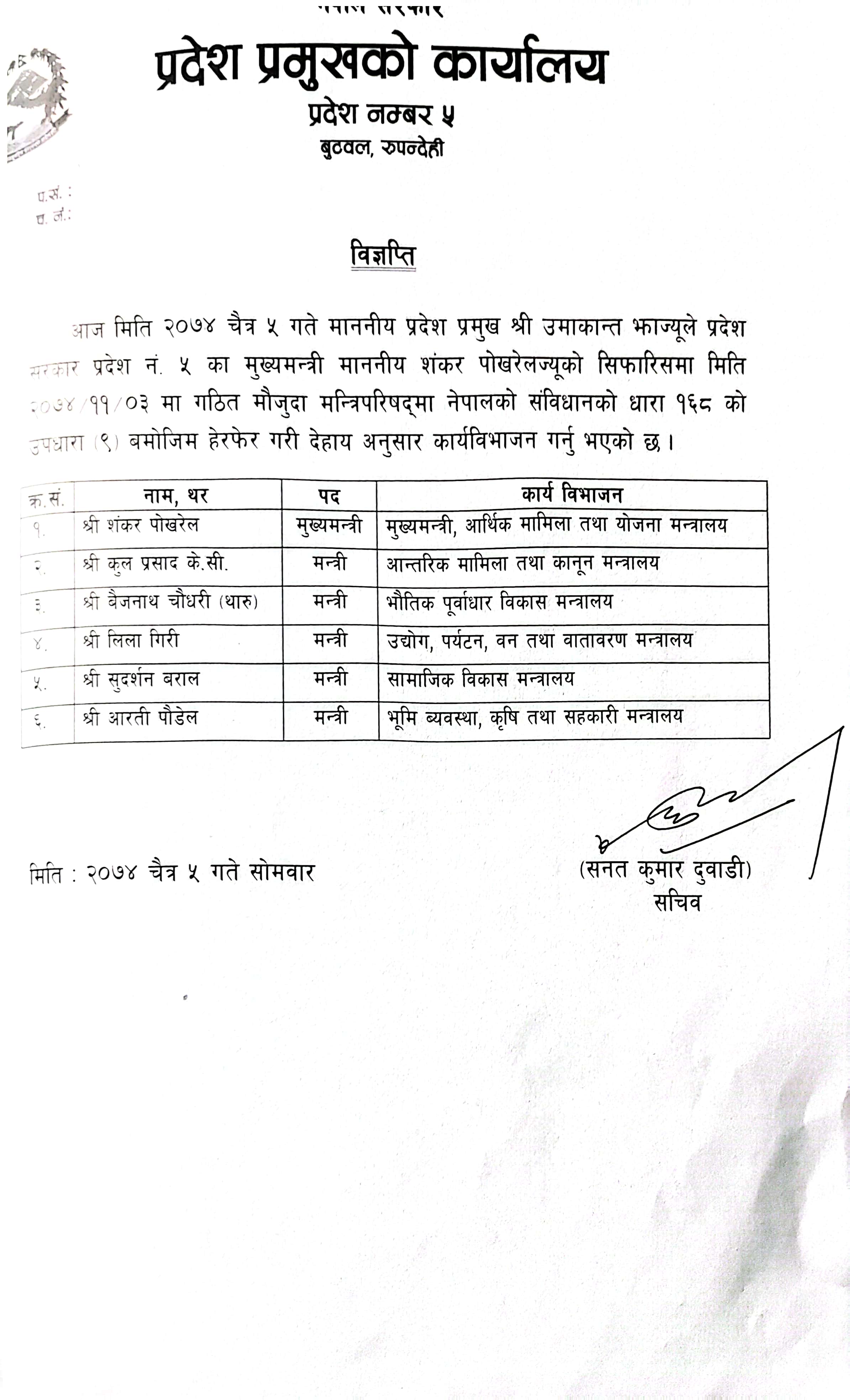 मन्त्रिपरिषद हेरफेर र कार्यविभाजन सम्बन्धि विज्ञप्ति ।