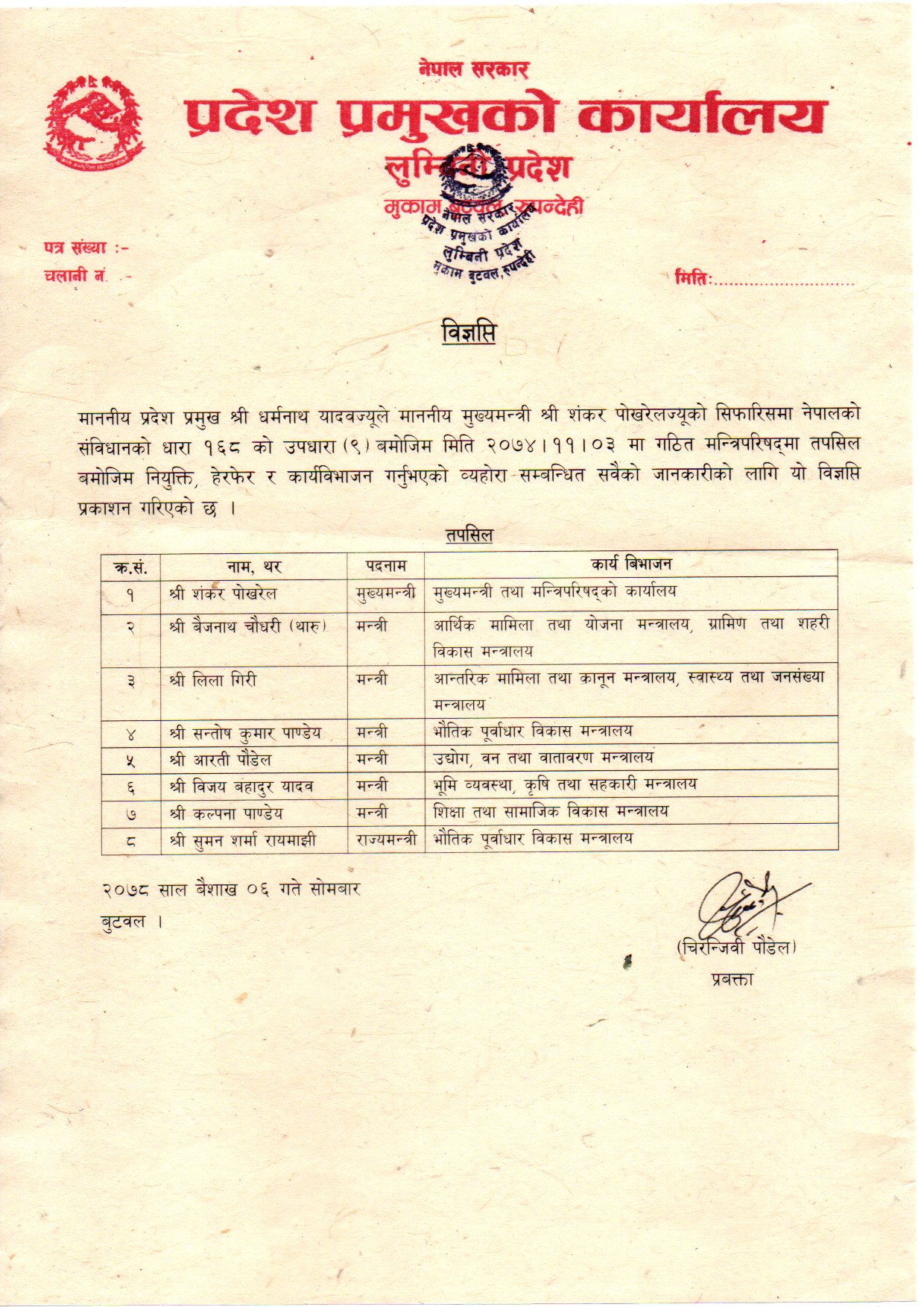 प्रदेश मन्त्रिपरिषद्मा नियुक्ति, हेरफेर र कार्यविभाजन सम्बन्धि विज्ञप्ति ।