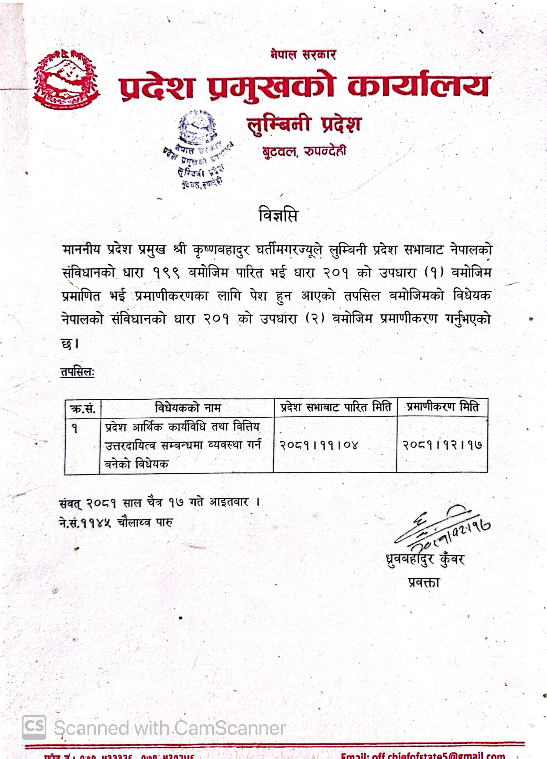 विधेयक प्रमाणीकरण गरिएको विज्ञप्ति